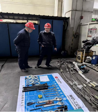 陈书记首先来到制粉系统检修工具定置区,对照清单逐一核验索具、扳手等工器具的检验标识与完好状态。陈书记强调,制粉系统属于高粉尘、高风险区域,工器具是检修作业的“第一道防线”,承包商必须严格执行“每日一检”制度,坚决杜绝不合格工具流入现场。在与班组人员交流时,他详细询问了索具报废周期与更新机制,要求项目部牵头建立工器具动态管理台账,做到全生命周期可追溯。